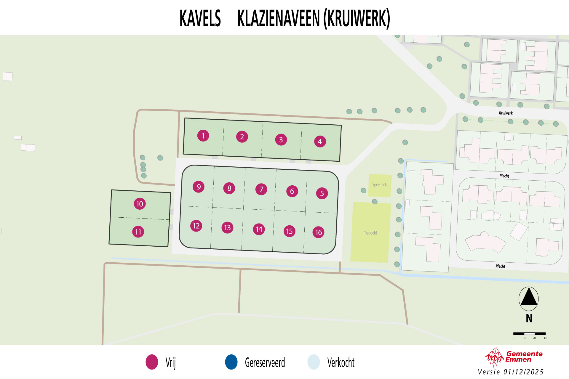 Aan het Jaagpad bij Het Kruiwerk in Klazienaveen komen 16 nieuwe kavels voor woningen. Deze kavels liggen op het oude trapveld en de speeltuin. De verkoop van de eerste kavels start waarschijnlijk in de eerste helft van 2026.